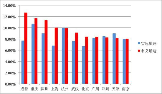 编者注:“实际增速”是按照可比价格计算,剔除了价格因素。“名义增速”是用这一年数据直接与上一年数据比较所得,在比较单年的城市GDP时,很多论者更喜欢用名义增速。另外,成都名义增速之所以如此之高,可能与新代管了简阳市有关系。
