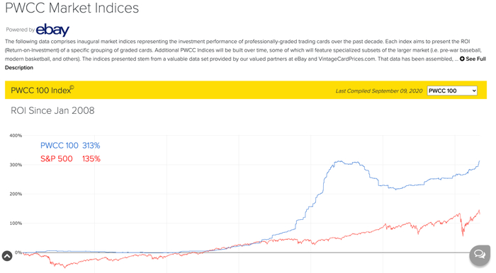 截止今年9月,美国最大的交易卡投资、评价服务商PWCC官网显示,根据全球最知名的球星卡交易网站eBay提供的数据,在2008年1月到2018年十年时间内,PWCC通过追踪市面上100张球星卡样本发现这100张球星卡的回报率在313%左右,而同期的标普指数仅为135%。
