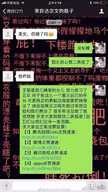 最近被刷屏的原因是各类花样的拉票文案,还有各种表情包的搭配文案SLOGAN,比如:地狱空荡荡,王菊在土创。你一转,我一转,菊姐就得500万。你若敢折我王菊翅膀,菊家军废你整个天堂。一菊两得:每当你想点外卖的时候,就给菊集资。你瘦了,菊活了。