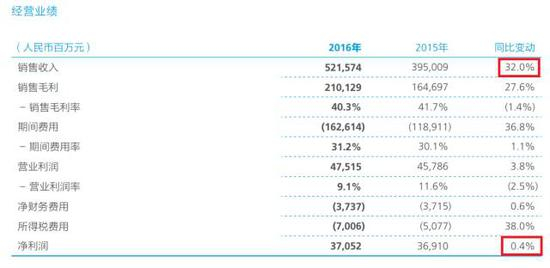 上面是华为2016年和2015年业绩的比较。2016年销售收入大增了32%,达到了5216亿元,但利润只比2015年微增了0.4%。以任正非的“居安思危”,华为现在肯定是比较焦虑的。