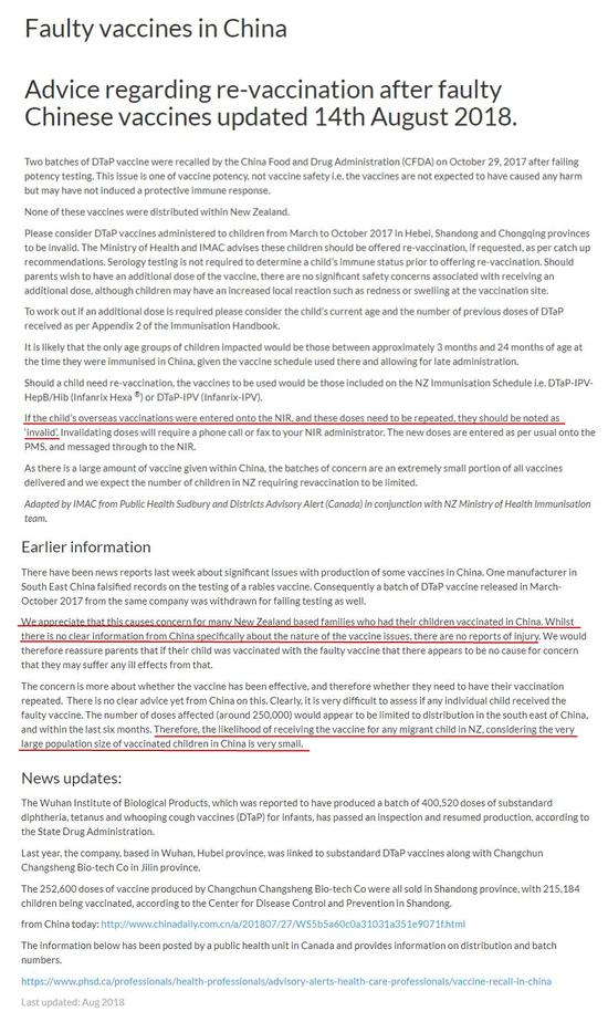 捉谣君查询新西兰免疫资讯中心的官网,却发现并没有该消息,只有一则8月14日发表的“中国疫苗有缺陷,建议重新接种的建议”(Faulty vaccines in China Advice regarding re-vaccination after faulty Chinese vaccines updated 14th August 2018。)。