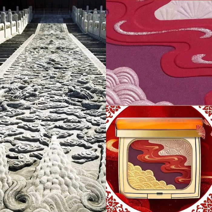 眼影盘的设计灵感来自于紫禁城的御道,石阶上的云霞、松针纹、水纹被复刻进了这小小的一盘。