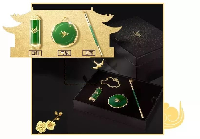 礼盒内含一块气垫粉底(凝露色)、一根眉笔和一支口红(珊瑚色、绾绾色、朱砂色可选)。