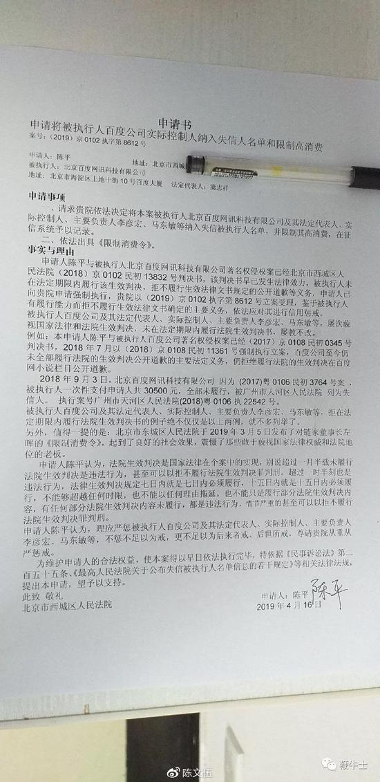 4月24日,作家陈平(微博昵称:陈文伍)在微博上公开表示,因百度未在法定期限内履行法院作出的公开道歉等判决,并屡次藐视国家法律和法院生效判决,未在法定期限内履行法院生效判决书,遂申请将百度公司及实际控制人李彦宏、马东敏等纳入失信人员名单和限制高消费。