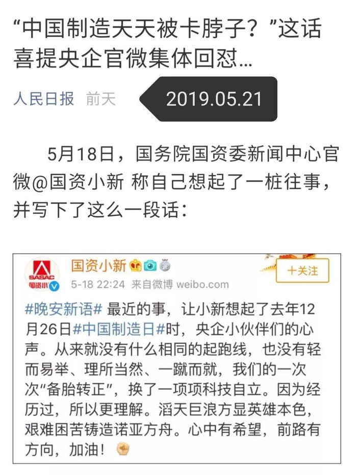 传媒茶话会注意到,5月21日,国资小新针对最近“卡脖子”的话题发了一条点赞国企自主创新的微博,引发了人民日报、央视新闻、观察者网等主流媒体的报道和评论(《最重要的是把自己的事做好(人民论坛)》点击阅读原文即可跳转阅读)。闫永在自己的微博上转发评论时这样写道:在复杂舆论生态中,政务新媒体既要当好政务服务的智能机、信息公开的时光机,也要当好猛怼谣言的粉碎机、正面传播的轰炸机,更要当好事实真相的挖掘机和新闻舆论的发动机。