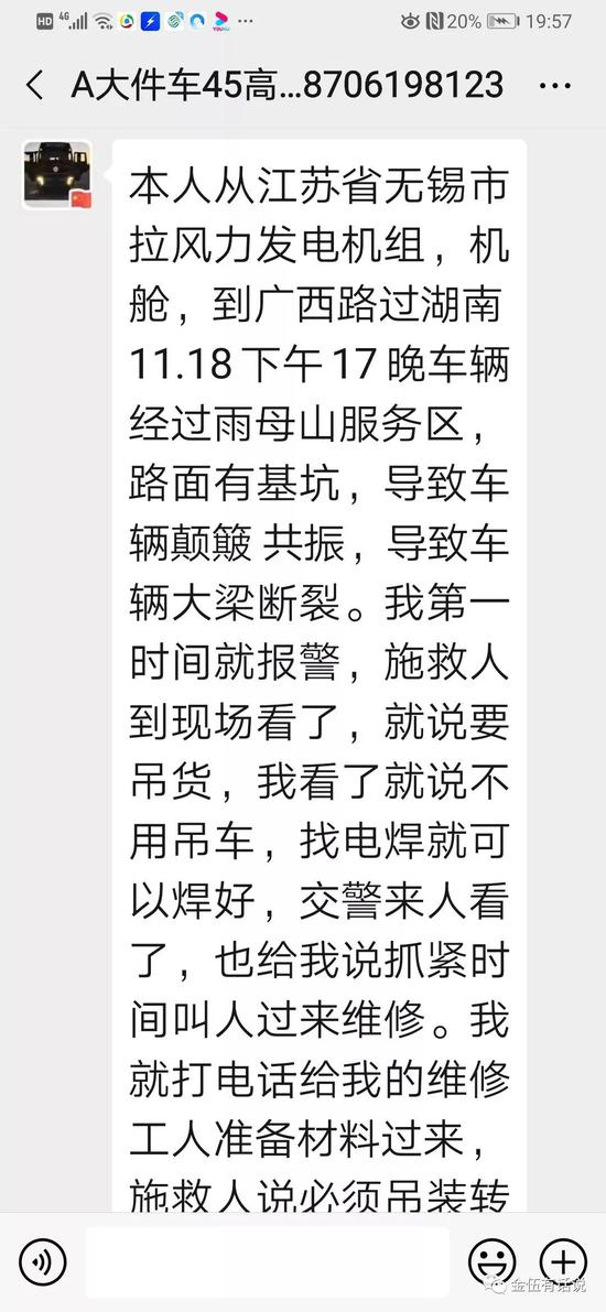 11月18日下午5点,刘师傅驾驶的大件运输车辆在经过衡阳市境内雨母山服务区时,路面凸凹不平,造成大件运输车大梁裂痕不能继续行使。刘师傅及时与家里联系,要求立即派员到达现场维修车辆,并向122报警。122报警电话要求拨打12122报案,刘师傅照做。