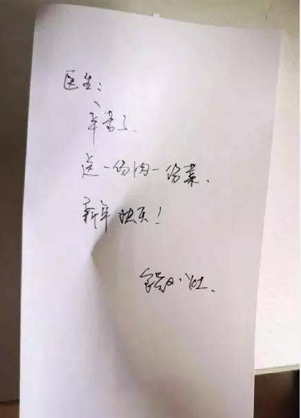 “医生:辛苦了。送一份肉一份菜。新年快乐!”