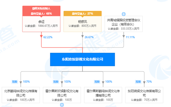 天眼查显示,于正旗下公司为12家,除欢娱文化之外,注册资本为1000万的浙江娱丸影视文化有限公司,于正持股70%。其与楚英平、杨银凤共同成立了共青城耀晖投资管理合伙企业,间接持有欢娱文化11.11%的股份。