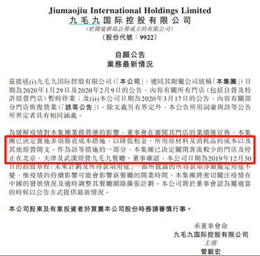 5月12日晚间,九毛九公告称,为了节省成本缓解疫情影响,决定关闭客流较少的门店,并停止在北京、天津及武汉经营九毛九餐厅。
