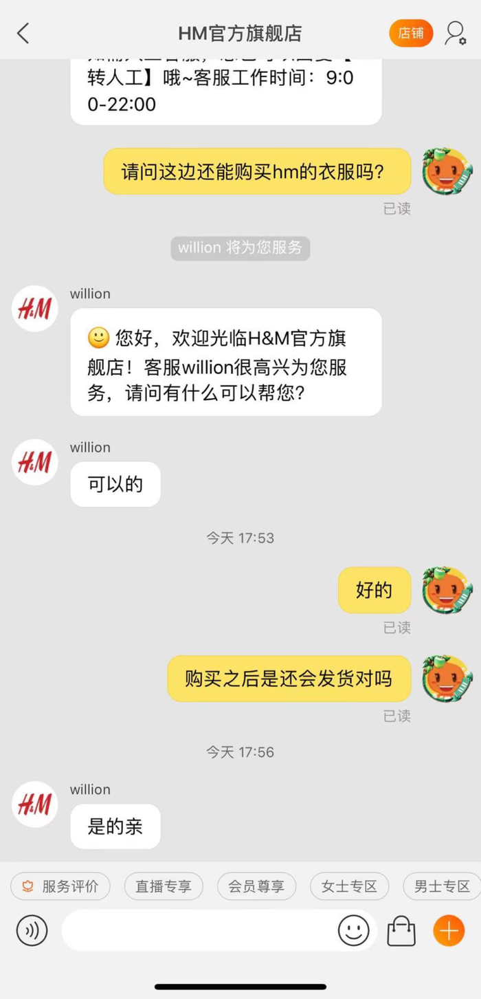 随后,蓝鲸记者又打开了淘宝及天猫平台,于18点前与HM旗舰店客服沟通时,该品牌还在销售。不过,截至记者发稿,再次进入淘宝搜索“HM”时,发现相关商品已被下架,无法被找到。