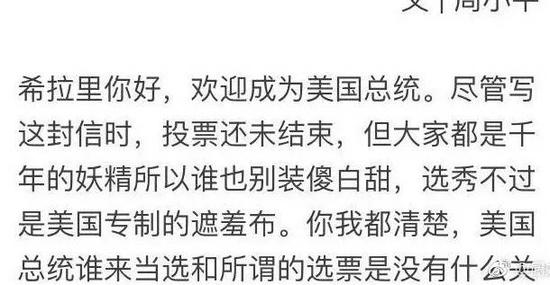 这套说法作者在去年年底的美国总统大选中也重复过:“美国总统谁来当选和所谓的选票是没有什么关系的”,早就内定好了,相信选举是靠数选票的人,不过是傻白甜。他在投票进行时,就提前祝贺希拉里当选。如果不是因为后来特朗普意外当选,相信这也会是一篇阅读百万加的热帖(尽管谁当选都不影响这篇文章是胡扯)。因为我们这一代人从小就是这么被灌输的,他不过是迎合了这套教育而已。