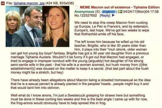 国外同类的民粹谣言站,比如臭名昭著的匿名论坛4chan,也曾想过在婚姻方面攻击马克龙。对方的思考方向是传马克龙和布丽吉特前夫的三女儿Tiphaine Auzière的绯闻,因为她比较漂亮,这样公众说不定会信。从来没想过什么族长老爷子拍拍肩膀说娶了我女儿你就飞黄腾达了之类的。后者的口味实在是太“中国”了。