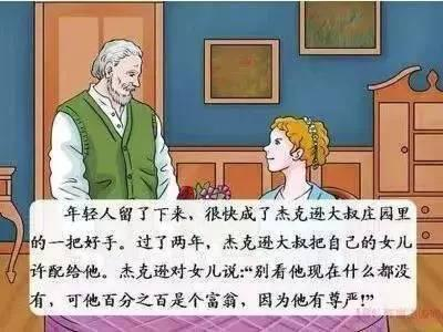 在人教小学四年级教材中,有一篇课文《尊严》,大意为:流浪到美国南加州的年轻难民执意用劳动换来食物,镇长杰克逊大叔很是赞赏,把女儿许配给他,预言他将会成功,因为他有尊严。这个难民便是石油大王哈默。
