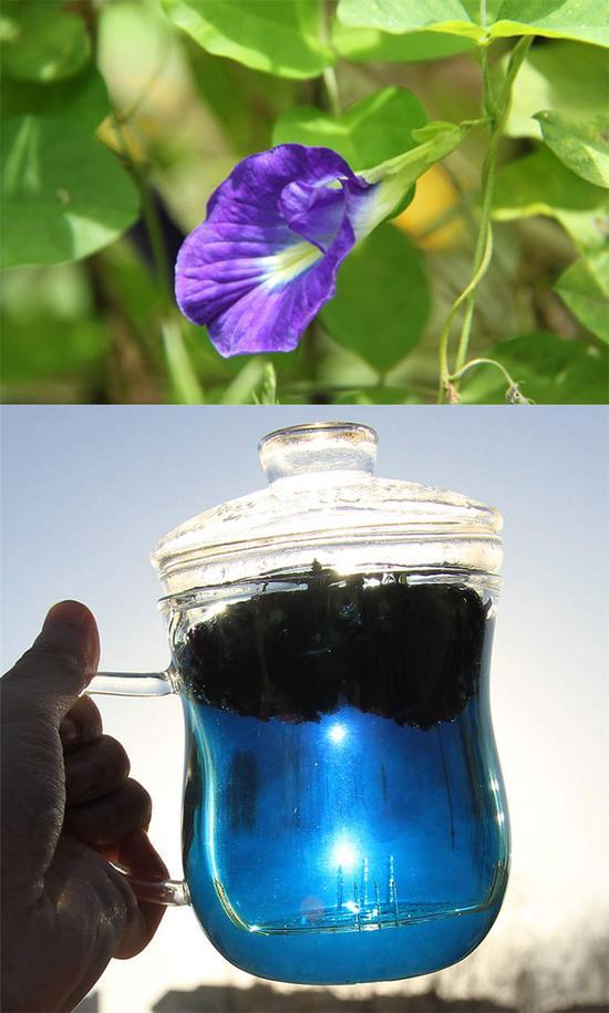 长在树上的蝶豆花看起来更偏向紫色,在东南亚这种植物也一直被当做天然的染料在使用,而且这种植物也可以被食用。把天然的蝶豆花拿去泡茶之后,你就会得到一杯纯天然无污染的蓝色饮料!