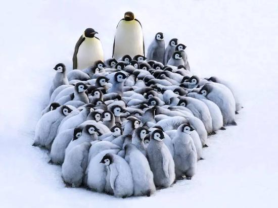 小家伙们的羽毛是灰色的,要长大以后,才换成金色的胸脯和黑色的皮毛。南极的风一般都很大,企鹅们会聚成一团,用身体组成一道防风墙,而小家伙们也会挤在一起,躲在成年企鹅中间取暖和防风。