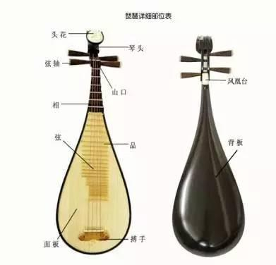 这是琵琶的头,它的相,它的品,它有四条弦,很多人觉得琵琶的琴背像是女人的背部,抱着它有一种很美好的形象。